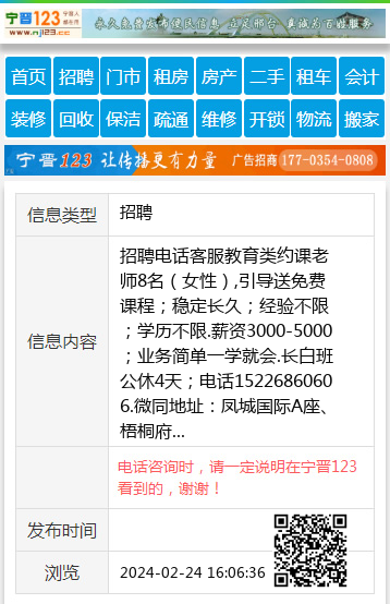| 防骗提醒: | 宁晋123(www.nj123.cc)提醒您:手工活、网络兼职、刷单,都是骗子!凡以各种名义收取费用的都是骗子!找工作是往兜里挣钱,让你往外掏钱的都是骗子!异地招聘请提高警惕,谨防诈骗! |