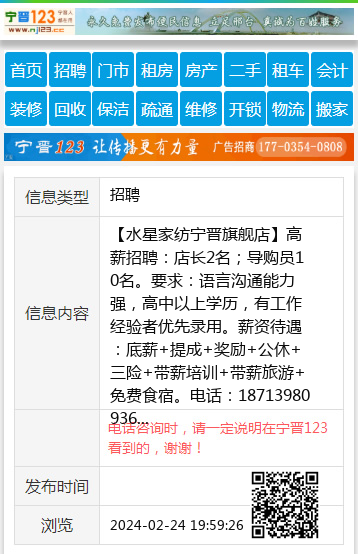 【水星家纺宁晋旗舰店】高薪招聘:店长2名;导购员10名。要求:语言沟通能力强,高中以上学历,有工作经验者优先录用。薪资待遇:底薪+提成+奖励+公休+三险+带薪培训+带薪旅游+免费食宿。电话:18713980936 【电话咨询时,请一定说明在宁晋123看到的,谢谢!】 |
