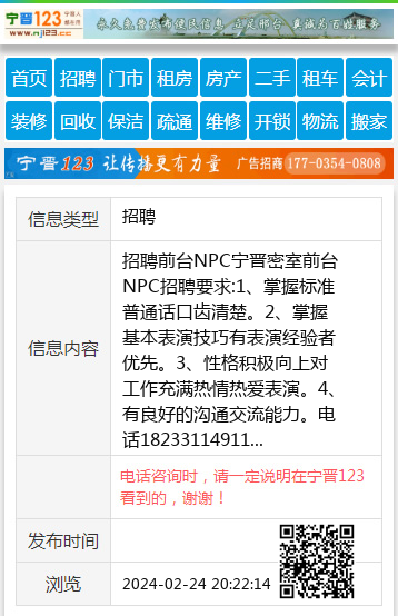 招聘前台NPC宁晋密室前台NPC招聘要求:1、掌握标准普通话口齿清楚。2、掌握基本表演技巧有表演经验者优先。3、性格积极向上对工作充满热情热爱表演。4、有良好的沟通交流能力。电话18233114911 【电话咨询时,请一定说明在宁晋123看到的,谢谢!】 |