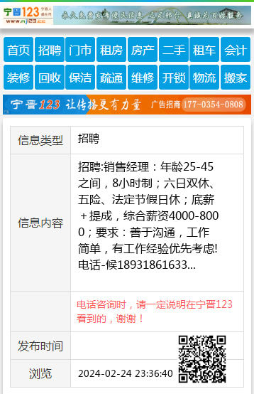 招聘:销售经理:年龄25-45之间,8小时制;六日双休、五险、法定节假日休;底薪+提成,综合薪资4000-8000;要求:善于沟通,工作简单,有工作经验优先考虑!电话-候18931861633 【电话咨询时,请一定说明在宁晋123看到的,谢谢!】 |