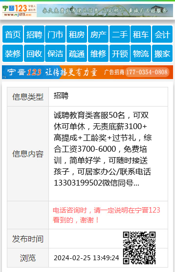 诚聘教育类客服50名,可双休可单休,无责底薪3100+高提成+工龄奖+过节礼,综合工资3700-6000,免费培训,简单好学,可随时接送孩子,可居家办公/联系电话13303199502微信同号 【电话咨询时,请一定说明在宁晋123看到的,谢谢!】 |