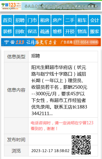 阳光生鲜超市华府店(状元路与赵宁线十字路口)诚招长期(一年以上)理货员、收银员若干名,薪酬2500元--3000元/月,要求45岁以下女性,有超市工作经验者优先录用。联系王店长18833442111 【电话咨询时,请一定说明在宁晋123看到的,谢谢!】 |
