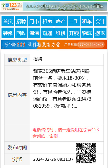 驿家365酒店老车站店招聘前台一名,要求18-30岁,有较好的沟通能力和服务意识,有经验者优先,工资待遇面议,有意者联系:13473081959,微信同号 【电话咨询时,请一定说明在宁晋123看到的,谢谢!】 |
