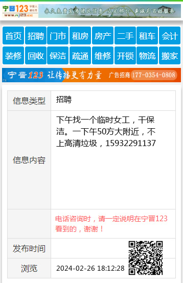 下午找一个临时女工,干保洁。一下午50方大附近,不上高清垃圾,15932291137