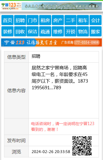 居然之家宁晋商场,招聘高级电工一名,年龄要求在45周岁以下,薪资面谈。18731995691...789
