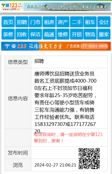 康师傅饮品招聘送货业务员数名工资底薪提成4000-7000左右上不封顶加节日福利要求年龄25-35岁吃苦耐劳,有责任心驾驶小型货车或骑三轮车沟通能力强,有销售工作经验者优先。联系电话15833297307或17717726720 【电话咨询时,请一定说明在宁晋123看到的,谢谢!】 |