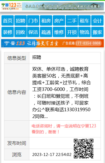 双休、单休可选,诚聘教育类客服50名,无责底薪+高提成+工龄奖+过节礼,综合工资3700-6000,工作时间:长白班和懒觉班,不倒班,可随时接送孩子,可居家办公^联系电话13303199502同微 【电话咨询时,请一定说明在宁晋123看到的,谢谢!】 |
