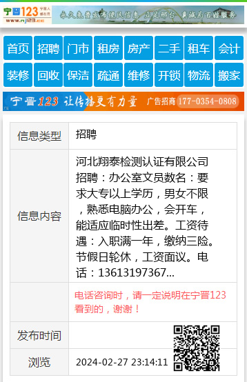 河北翔泰检测认证有限公司招聘:办公室文员数名:要求大专以上学历,男女不限,熟悉电脑办公,会开车,能适应临时性出差。工资待遇:入职满一年,缴纳三险。节假日轮休,工资面议。电话:13613197367 【电话咨询时,请一定说明在宁晋123看到的,谢谢!】 |