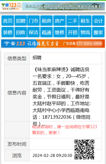 《味当家麻辣烫》诚聘店员一名要求:女,20—45岁,五官端正,手脚勤快,吃苦耐劳,工资面议,干得好有奖金,节假日福利,最好是大陆村赵平邱的,工作地址:大陆村中心小学西临路南电话:18713922036(微信同号) 【电话咨询时,请一定说明在宁晋123看到的,谢谢!】 |