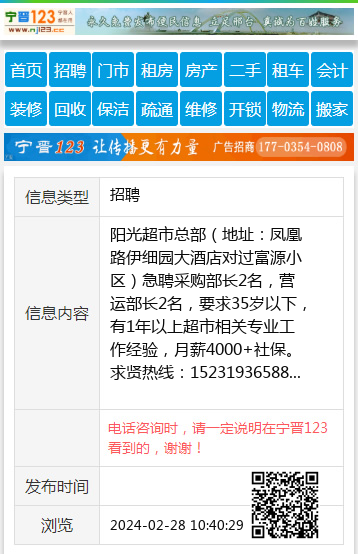 阳光超市总部(地址:凤凰路伊细园大酒店对过富源小区)急聘采购部长2名,营运部长2名,要求35岁以下,有1年以上超市相关专业工作经验,月薪4000+社保。求贤热线:15231936588 【电话咨询时,请一定说明在宁晋123看到的,谢谢!】 |