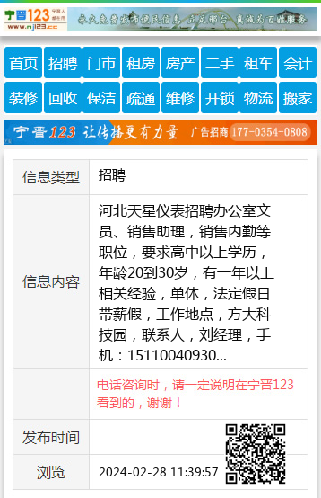 河北天星仪表招聘办公室文员、销售助理,销售内勤等职位,要求高中以上学历,年龄20到30岁,有一年以上相关经验,单休,法定假日带薪假,工作地点,方大科技园,联系人,刘经理,手机:15110040930 【电话咨询时,请一定说明在宁晋123看到的,谢谢!】 |