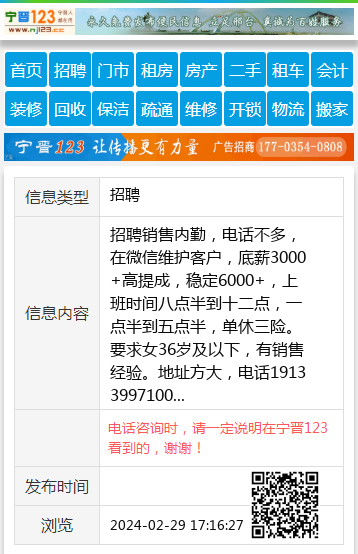 招聘销售内勤,电话不多,在微信维护客户,底薪3000+高提成,稳定6000+,上班时间八点半到十二点,一点半到五点半,单休三险。要求女36岁及以下,有销售经验。地址方大,电话19133997100 【电话咨询时,请一定说明在宁晋123看到的,谢谢!】 |