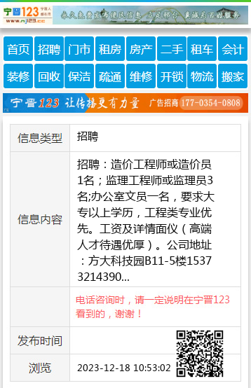 招聘:造价工程师或造价员1名;监理工程师或监理员3名;办公室文员一名,要求大专以上学历,工程类专业优先。工资及详情面仪(高端人才待遇优厚)。公司地址:方大科技园B11-5楼15373214390 【电话咨询时,请一定说明在宁晋123看到的,谢谢!】 |