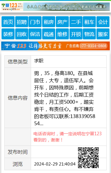 男,35,身高180。在县城居住,大专,退伍军人。会开车,因特殊原因,前期想找个日结的工作,后期工资稳定,月工资5000+,踏实肯干,有责任心。有不嫌弃的老板可以联系:13833905854 【电话咨询时,请一定说明在宁晋123看到的,谢谢!】 |