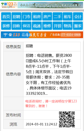 招聘:电话销售。薪资2800➕提成6.5小时工作制(上午8点半-11点半,下午1点半-5点)周末双休,法定节假日带薪休假;要求:20-35男女不限,有工作经验者优先,具体体细节面议;电话19333923019 【电话咨询时,请一定说明在宁晋123看到的,谢谢!】 |