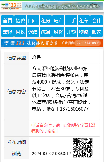 方大采纳能源科技因业务拓展招聘电话销售4到6名,底薪4000+提成,双休+法定节假日,22至30岁,专科及以上学历,会展/营销/新媒体运营/网络推广/平面设计,电话:张女士13716016077 【电话咨询时,请一定说明在宁晋123看到的,谢谢!】 |