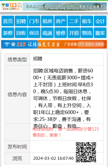 招聘:区域电话销售,薪资6000+(无责底薪3000+提成+上不封顶)上班时间:早8点30,晚5点30,每周日休息,可调休,节假日放假,社保,有人带,有上升空间,入职1年以上稳定6000+,要求:25-38岁,善于沟通,有责任心,勤奋,有电话销售经验的优先,地址:方大科技园,电话:郭先生 15200001468,19133997100 【电话咨询时,请一定说明在宁晋123看到的,谢谢!】 |