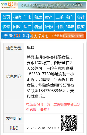 聘网店拼多多客服限女性,要求长期稳定,倒班管住2天公休可上三险有意可联系18233017759地址实验一小附近,另聘美工平面设计限女性,能熟练使用PS即可有意联系13473053346地址天和城附近 【电话咨询时,请一定说明在宁晋123看到的,谢谢!】 |