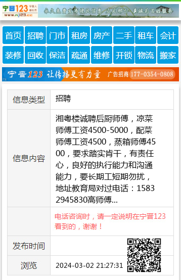 湘粤楼诚聘后厨师傅,凉菜师傅工资4500-5000,配菜师傅工资4500,蒸箱师傅4500,要求踏实肯干,有责任心,良好的执行能力和沟通能力,要长期工短期勿扰,地址教育局对过电话:15832945830高师傅 【电话咨询时,请一定说明在宁晋123看到的,谢谢!】 |
