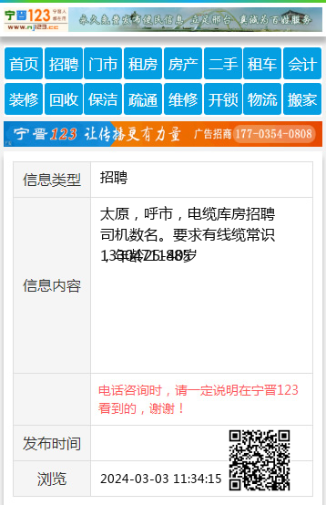 太原,呼市,电缆库房招聘司机数名。要求有线缆常识,年龄25-40岁 13304711885