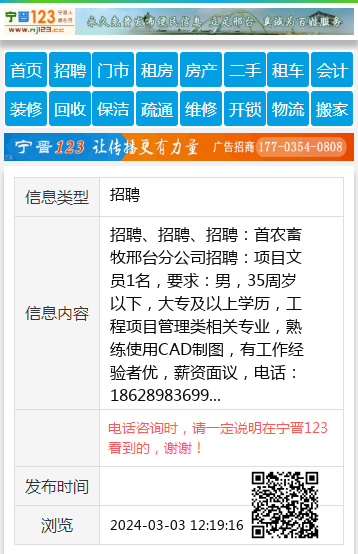 招聘、招聘、招聘:首农畜牧邢台分公司招聘:项目文员1名,要求:男,35周岁以下,大专及以上学历,工程项目管理类相关专业,熟练使用CAD制图,有工作经验者优,薪资面议,电话:18628983699 【电话咨询时,请一定说明在宁晋123看到的,谢谢!】 |