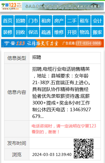 招聘,电缆行业电话销售精英,地址:县城要求:女年龄21-38岁.五官端正有上进心。具有团队协作精神有销售经验者优先录取薪资待遇:底薪3000+提成+奖金8小时工作制公休四天电话:13463927679 【电话咨询时,请一定说明在宁晋123看到的,谢谢!】 |