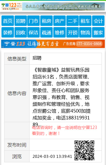 《智趣童城》益智玩具乐园招店长1名,负责店面管理、推广运营、创新升级,要求形象佳、责任心和团队服务意识强,有教育、销售、视频制作和管理经验优先,地点世爵公馆,底薪4500加提成加奖金,电话18831993189 【电话咨询时,请一定说明在宁晋123看到的,谢谢!】 |