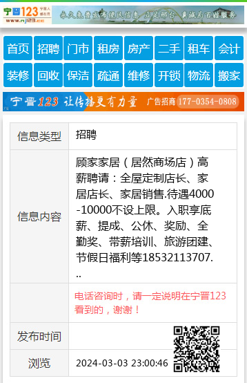 顾家家居(居然商场店)高薪聘请:全屋定制店长、家居店长、家居销售.待遇4000-10000不设上限。入职享底薪、提成、公休、奖励、全勤奖、带薪培训、旅游团建、节假日福利等18532113707 【电话咨询时,请一定说明在宁晋123看到的,谢谢!】 |