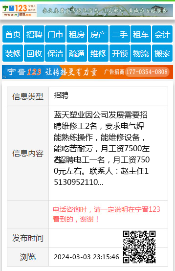 2招聘电工一名,月工资7500元左右。联系人:赵主任15130952110 【电话咨询时,请一定说明在宁晋123看到的,谢谢!】 |