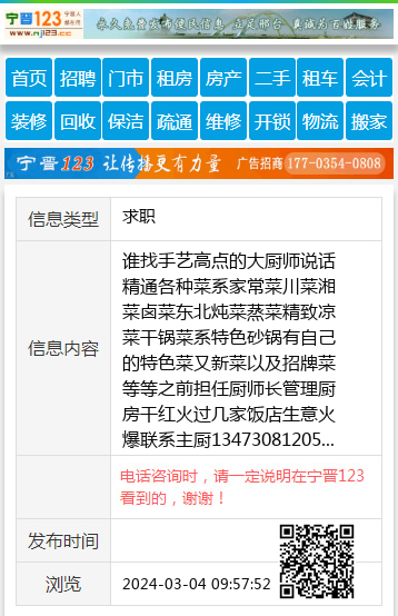 谁找手艺高点的大厨师说话精通各种菜系家常菜川菜湘菜卤菜东北炖菜蒸菜精致凉菜干锅菜系特色砂锅有自己的特色菜又新菜以及招牌菜等等之前担任厨师长管理厨房干红火过几家饭店生意火爆联系主厨13473081205 【电话咨询时,请一定说明在宁晋123看到的,谢谢!】 |