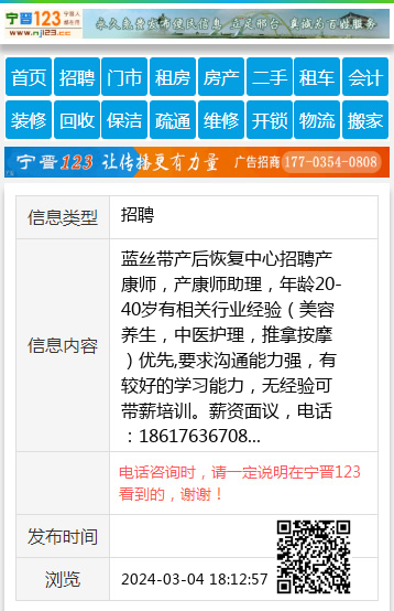 蓝丝带产后恢复中心招聘产康师,产康师助理,年龄20-40岁有相关行业经验(美容养生,中医护理,推拿按摩)优先,要求沟通能力强,有较好的学习能力,无经验可带薪培训。薪资面议,电话:18617636708 【电话咨询时,请一定说明在宁晋123看到的,谢谢!】 |