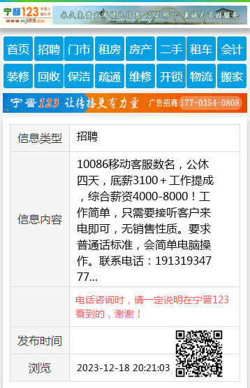 10086移动客服数名,公休四天,底薪3100+工作提成,综合薪资4000-8000!工作简单,只需要接听客户来电即可,无销售性质。要求普通话标准,会简单电脑操作。联系电话:19131934777 【电话咨询时,请一定说明在宁晋123看到的,谢谢!】 |