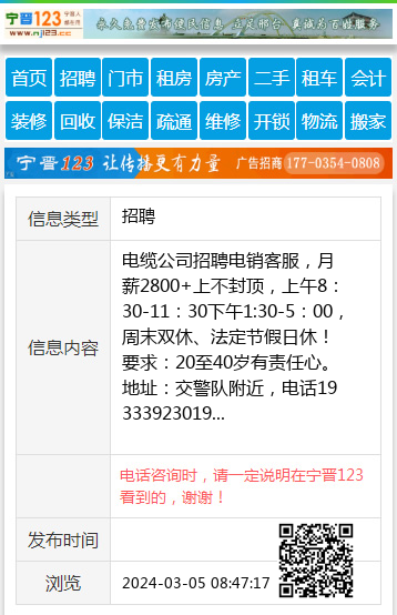 电缆公司招聘电销客服,月薪2800+上不封顶,上午8:30-11:30下午1:30-5:00,周末双休、法定节假日休!要求:20至40岁有责任心。地址:交警队附近,电话19333923019 【电话咨询时,请一定说明在宁晋123看到的,谢谢!】 |