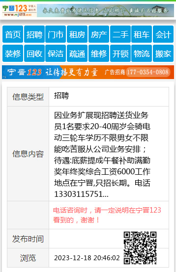因业务扩展现招聘送货业务员1名要求20-40周岁会骑电动三轮车学历不限男女不限能吃苦服从公司业务安排;待遇:底薪提成午餐补助满勤奖年终奖综合工资6000工作地点在宁晋,只招长期。电话13303115751 【电话咨询时,请一定说明在宁晋123看到的,谢谢!】 |