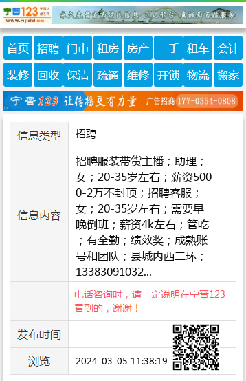 招聘服装带货主播;助理;女;20-35岁左右;薪资5000-2万不封顶;招聘客服;女;20-35岁左右;需要早晚倒班;薪资4k左右;管吃;有全勤;绩效奖;成熟账号和团队;县城内西二环;13383091032 【电话咨询时,请一定说明在宁晋123看到的,谢谢!】 |