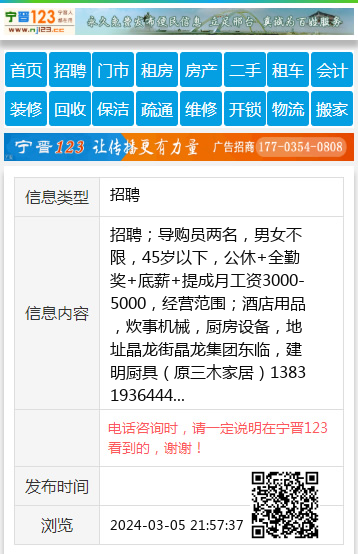 招聘;导购员两名,男女不限,45岁以下,公休+全勤奖+底薪+提成月工资3000-5000,经营范围;酒店用品,炊事机械,厨房设备,地址晶龙街晶龙集团东临,建明厨具(原三木家居)13831936444 【电话咨询时,请一定说明在宁晋123看到的,谢谢!】 |