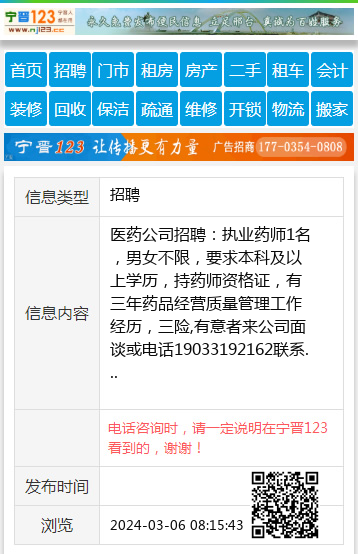 医药公司招聘:执业药师1名,男女不限,要求本科及以上学历,持药师资格证,有三年药品经营质量管理工作经历,三险,有意者来公司面谈或电话19033192162联系 【电话咨询时,请一定说明在宁晋123看到的,谢谢!】 |