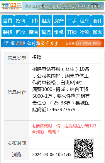 招聘电话客服(女生)10名,公司氛围好,周末单休工作简单轻松,白班8小时,底薪3000+提成,综合工资5000-1万,要求性格开朗有责任心..(25-38岁)县城医院附近13463927679 【电话咨询时,请一定说明在宁晋123看到的,谢谢!】 |