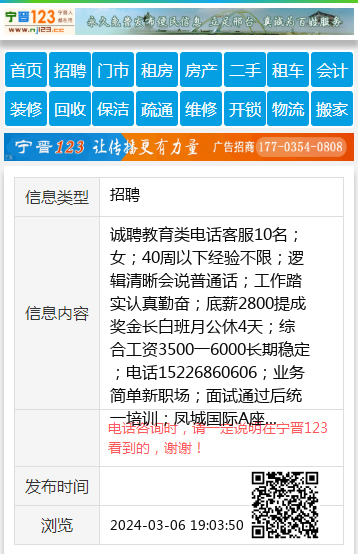 诚聘教育类电话客服10名;女;40周以下经验不限;逻辑清晰会说普通话;工作踏实认真勤奋;底薪2800提成奖金长白班月公休4天;综合工资3500一6000长期稳定;电话15226860606;业务简单新职场;面试通过后统一培训;凤城国际A座 【电话咨询时,请一定说明在宁晋123看到的,谢谢!】 |