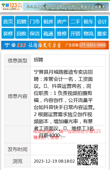宁晋县月城路雅迪专卖店招聘:库管会计一名,工资面议。❶、抖音运营两名,岗位职责:1 负责视频拍摄剪辑,内容创作,公开流量平台如抖音快手日常内容运营。2 根据运营需求独立创作视频剧本,增加曝光率,有意者工资面议。❷、维修工3名,月薪4000-8000元,25-40岁,踏实勤快,有亲和力,沟通能力,有维修经验者优先。 ❸、导购5名,要求25—40周岁优先,男女不限,会笑会聊天,着急赚钱,月平均工资:普通导购4000起步,优秀导购5000起步。 ❹、送货司机,年龄35到45岁,有意面谈。