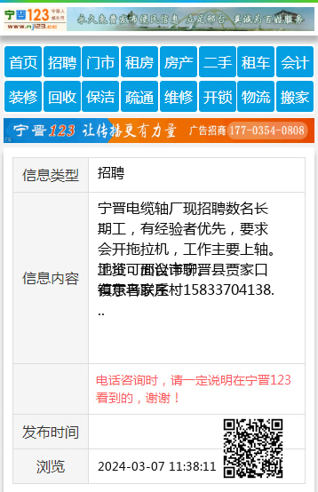 宁晋电缆轴厂现招聘数名长期工,有经验者优先,要求会开拖拉机,工作主要上轴。工资可面议详聊。