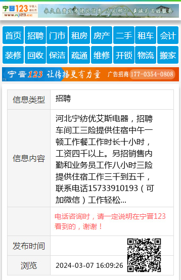 河北宁纺优艾斯电器,招聘车间工三险提供住宿中午一顿工作餐工作时长十小时,工资四千以上。另招销售内勤和业务员工作八小时三险提供住宿工作三千到五千,联系电话15733910193(可加微信)工作轻松 【电话咨询时,请一定说明在宁晋123看到的,谢谢!】 |