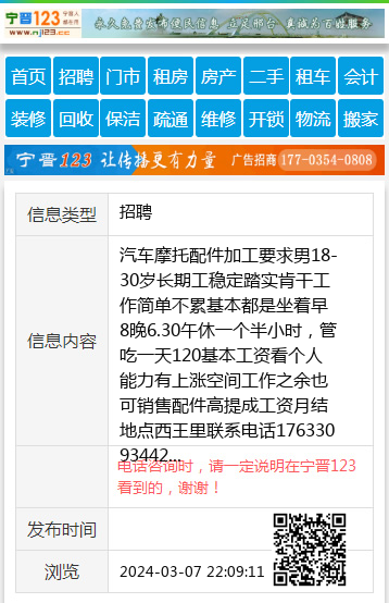 汽车摩托配件加工要求男18-30岁长期工稳定踏实肯干工作简单不累基本都是坐着早8晚6.30午休一个半小时,管吃一天120基本工资看个人能力有上涨空间工作之余也可销售配件高提成工资月结地点西王里联系电话17633093442 【电话咨询时,请一定说明在宁晋123看到的,谢谢!】 |