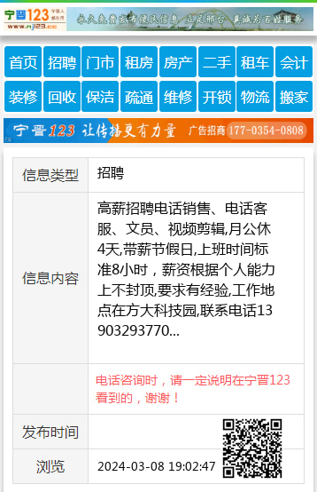 高薪招聘电话销售、电话客服、文员、视频剪辑,月公休4天,带薪节假日,上班时间标准8小时,薪资根据个人能力上不封顶,要求有经验,工作地点在方大科技园,联系电话13903293770 【电话咨询时,请一定说明在宁晋123看到的,谢谢!】 |