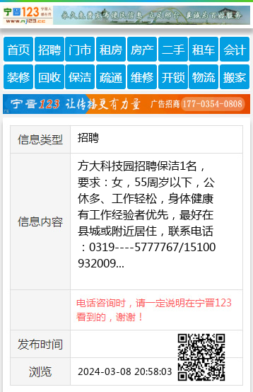 方大科技园招聘保洁1名,要求:女,55周岁以下,公休多、工作轻松,身体健康有工作经验者优先,最好在县城或附近居住,联系电话:0319----5777767/15100932009 【电话咨询时,请一定说明在宁晋123看到的,谢谢!】 |