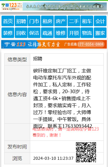 碳纤维定制工厂招工,主做电动车摩托车汽车外观的配件加工,私人定制,工作轻松,要求男,20-30岁,待遇工资4-6k+销售提成上不封顶,要求踏实肯干,月入过万!零经验也可,大师傅一手提拔。中午管饭。具体面议。联系王17633093442 【电话咨询时,请一定说明在宁晋123看到的,谢谢!】 |