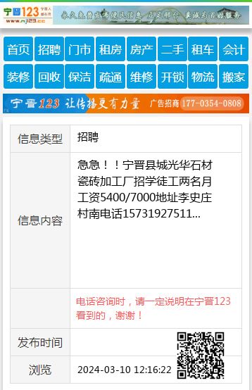 急急!!宁晋县城光华石材瓷砖加工厂招学徒工两名月工资5400/7000地址李史庄村南电话15731927511