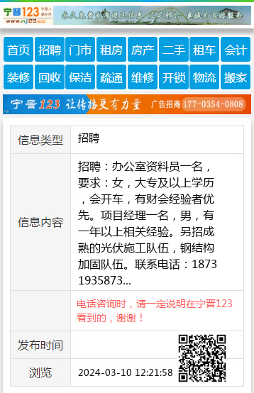 招聘:办公室资料员一名,要求:女,大专及以上学历,会开车,有财会经验者优先。项目经理一名,男,有一年以上相关经验。另招成熟的光伏施工队伍,钢结构加固队伍。联系电话:18731935873