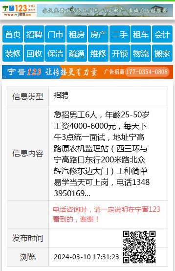 急招男工6人,年齡25-50岁工资4000-6000元,每天下午3点统一面试,地址宁高路原农机监理站(西三环与宁高路口东行200米路北众辉汽修东边大门)工种简单易学当天可上岗,电话13483950169 【电话咨询时,请一定说明在宁晋123看到的,谢谢!】 |