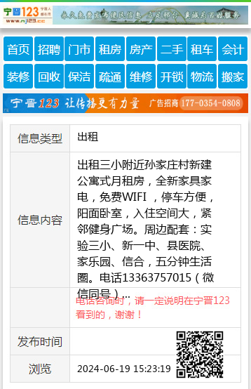 出租三小附近孙家庄村新建公寓式月租房,全新家具家电,免费WIFI ,停车方便,阳面卧室,入住空间大,紧邻健身广场。周边配套:实验三小、新一中、县医院、家乐园、信合,五分钟生活圈。电话13363757015(微信同号) 【电话咨询时,请一定说明在宁晋123看到的,谢谢!】 |
